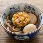- 盛り付け 器にうどんと具材を盛り付けて完成です。お好みでネギや天ぷらをトッピングしてください。