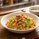 回鍋肉の濃厚な甘辛いタレがご飯一粒一粒にコーティングされ、非常に奥深い味わいを感じられます。前述の通り、こちらの記事で紹介した回鍋肉には野菜やお肉の旨味が凝縮されているため、追加の調味料が少なくても味が決まりやすいのが魅力です。ラードのコクと回鍋肉の味噌の風味が合わさり、満足感のあるガッツリとした一品に仕上がりました。